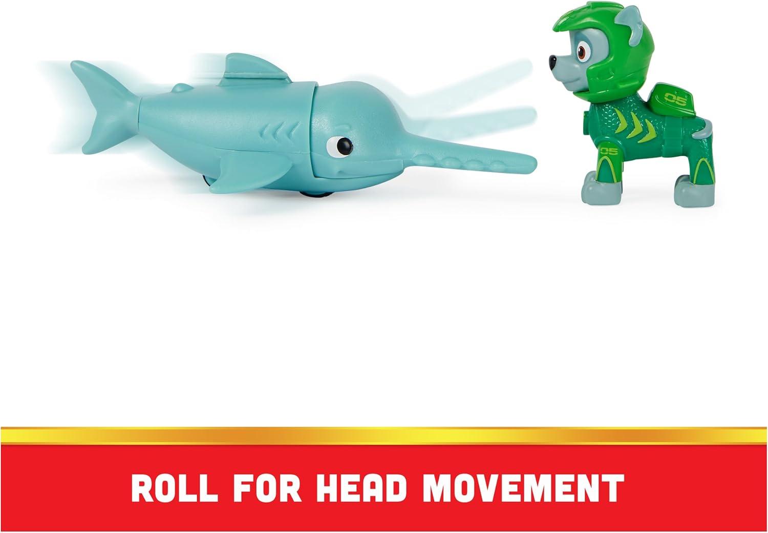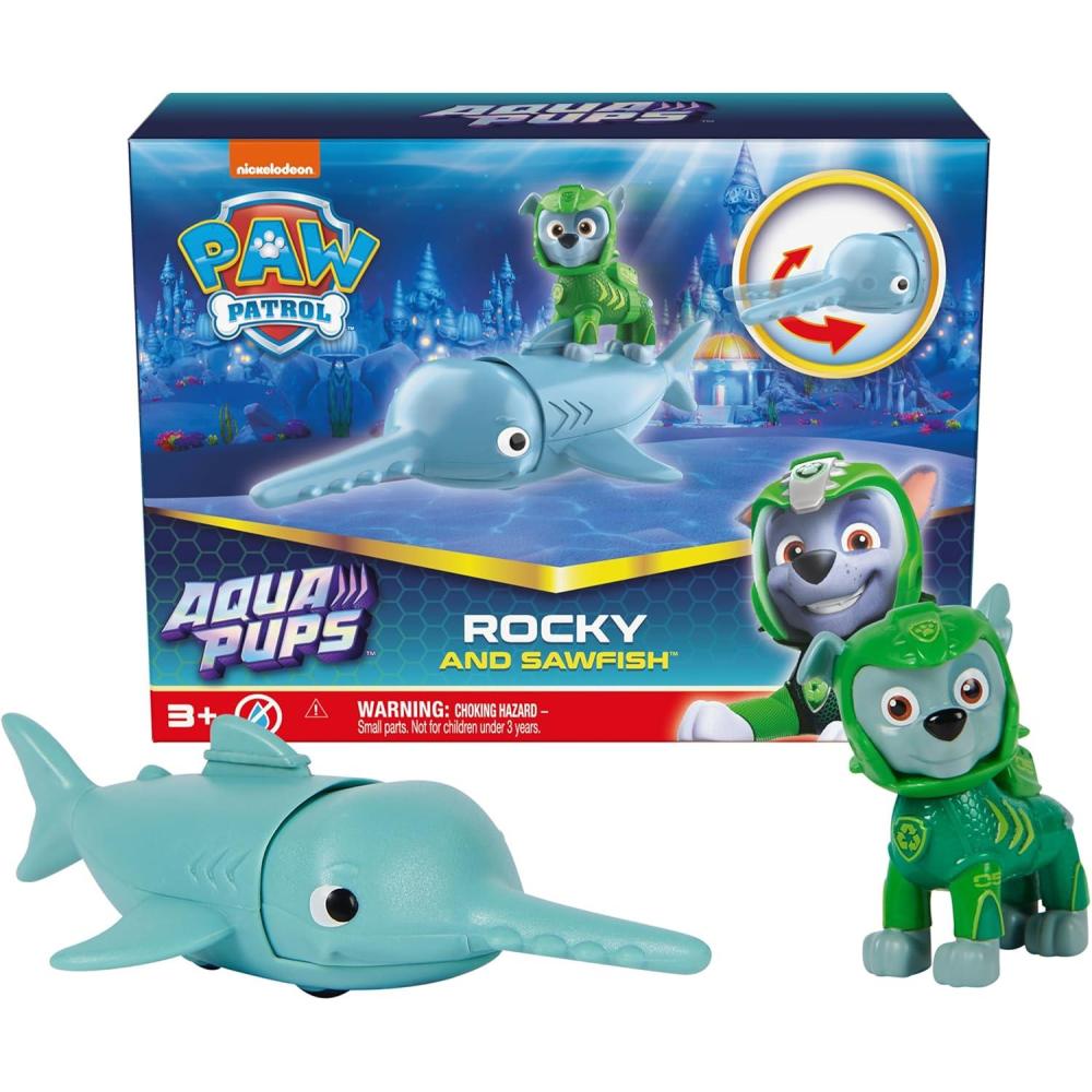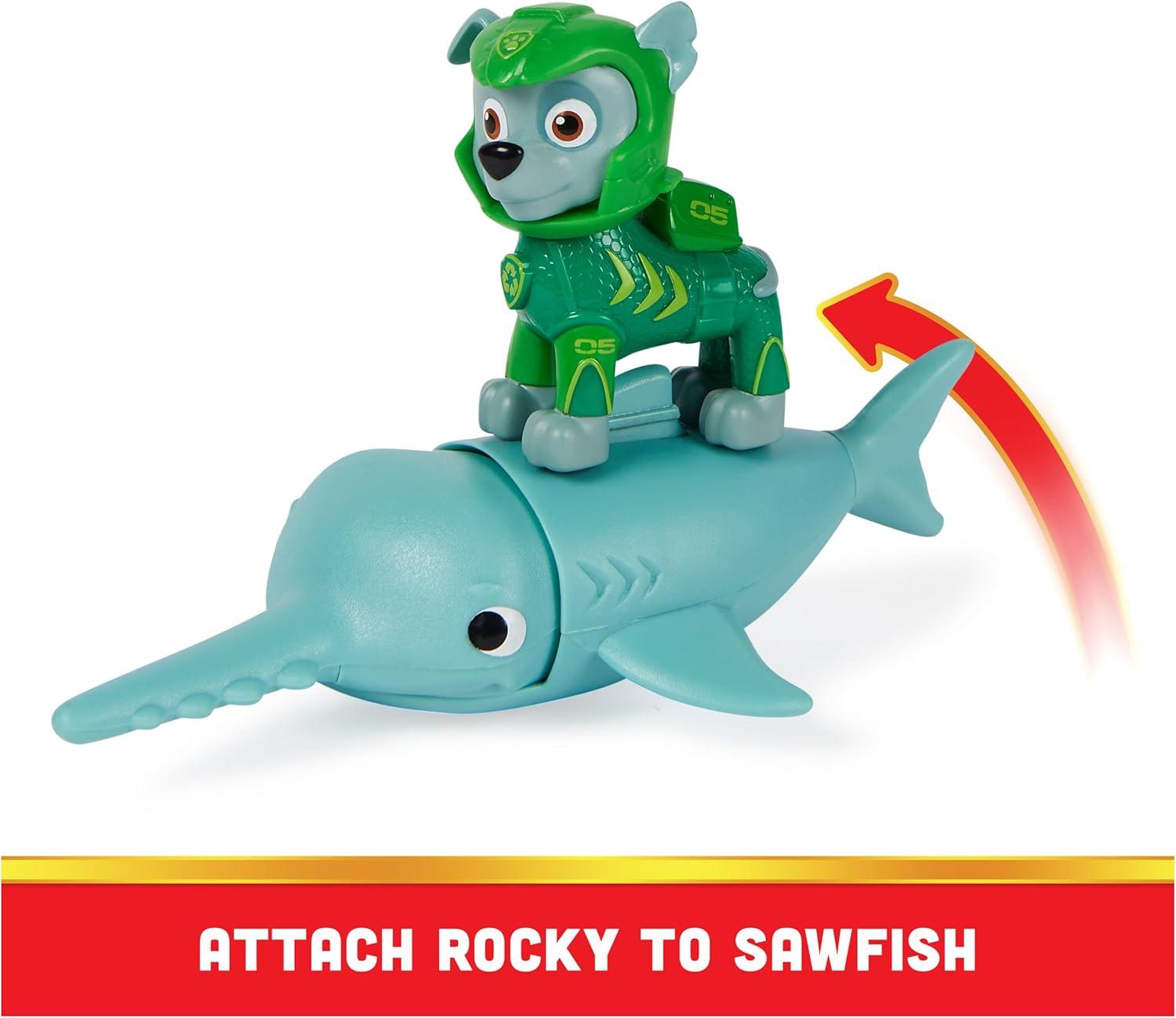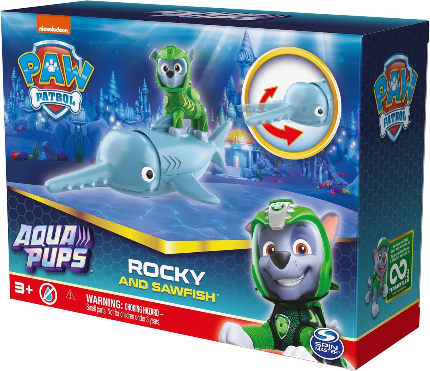 Get ready for exciting rescue adventures on the high seas with your favorite pups, and their new aquatic friends, as they go on exciting rescue missions with the PAW Patrol Aqua Pups! This action figures set includes Rocky, in his all new wetsuit uniform, and his trusty Sawfish pal! PAW Patrol’s beloved pup is ready to jump into action! Attach Rocky onto the fin on Sawfish’s back and roll Sawfish forward, to activate his Sawfish head-swipe movement, as you race to the rescue and save the day! Featuring authentic true-to show details and styling, this awesome set brings all the underwater fun from the hit TV show to life! Then, for even more exciting series-inspired missions, collect all the PAWsome Aqua Pups figures and toy vehicles, along with the Whale Patroller team vehicle (each sold separately) for endless hours of action-packed adventures! With PAW Patrol toys, kids can explore their imaginations and develop their motor skills, through pretend play, as they bring their favorite scenes from the show to life! PAW Patrol action figures, toy cars, playsets and stuffed animals are the perfect toys for boys and girls aged 3 and up, so bring home the excitement of the PAW Patrol: Aqua Pups!