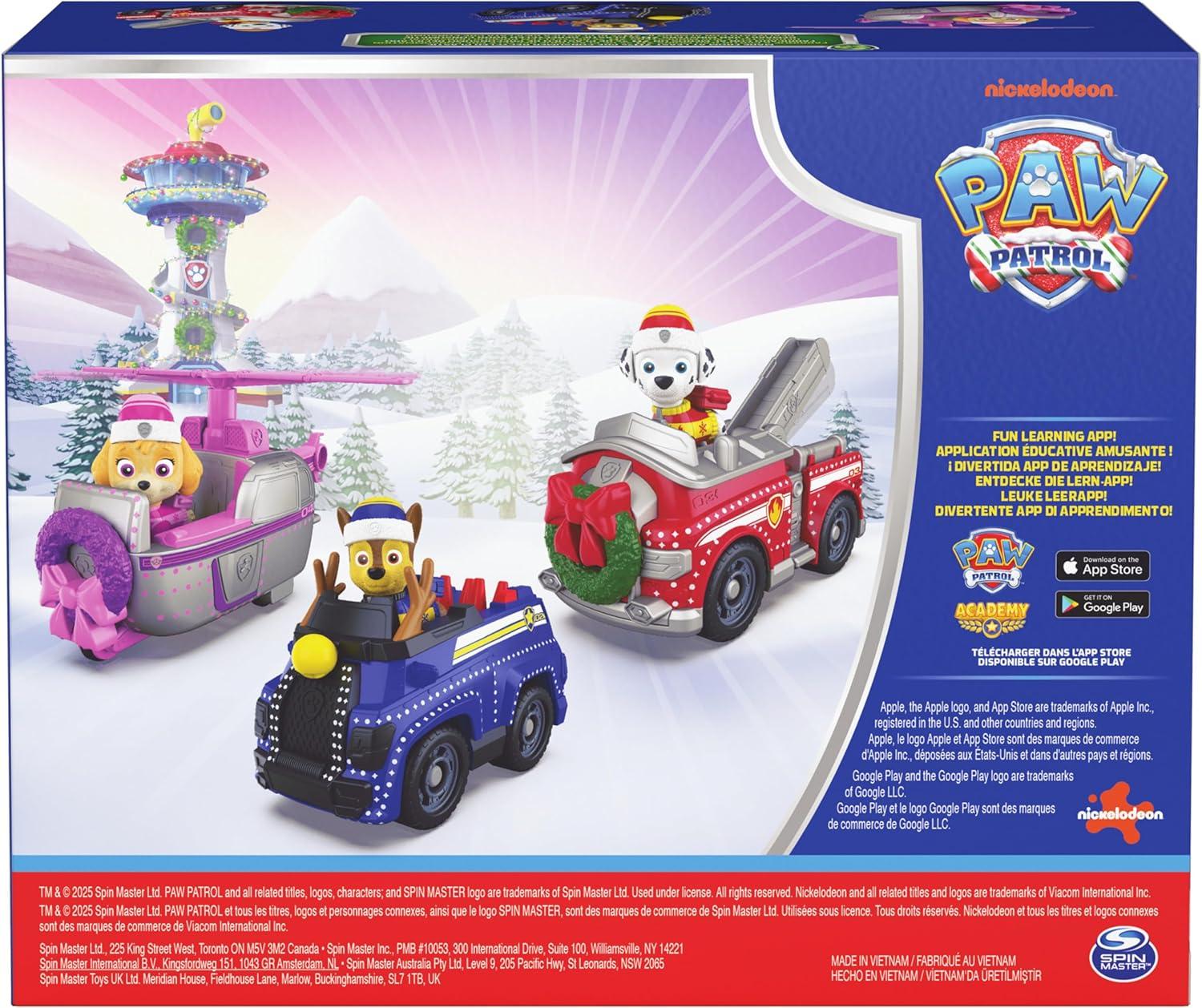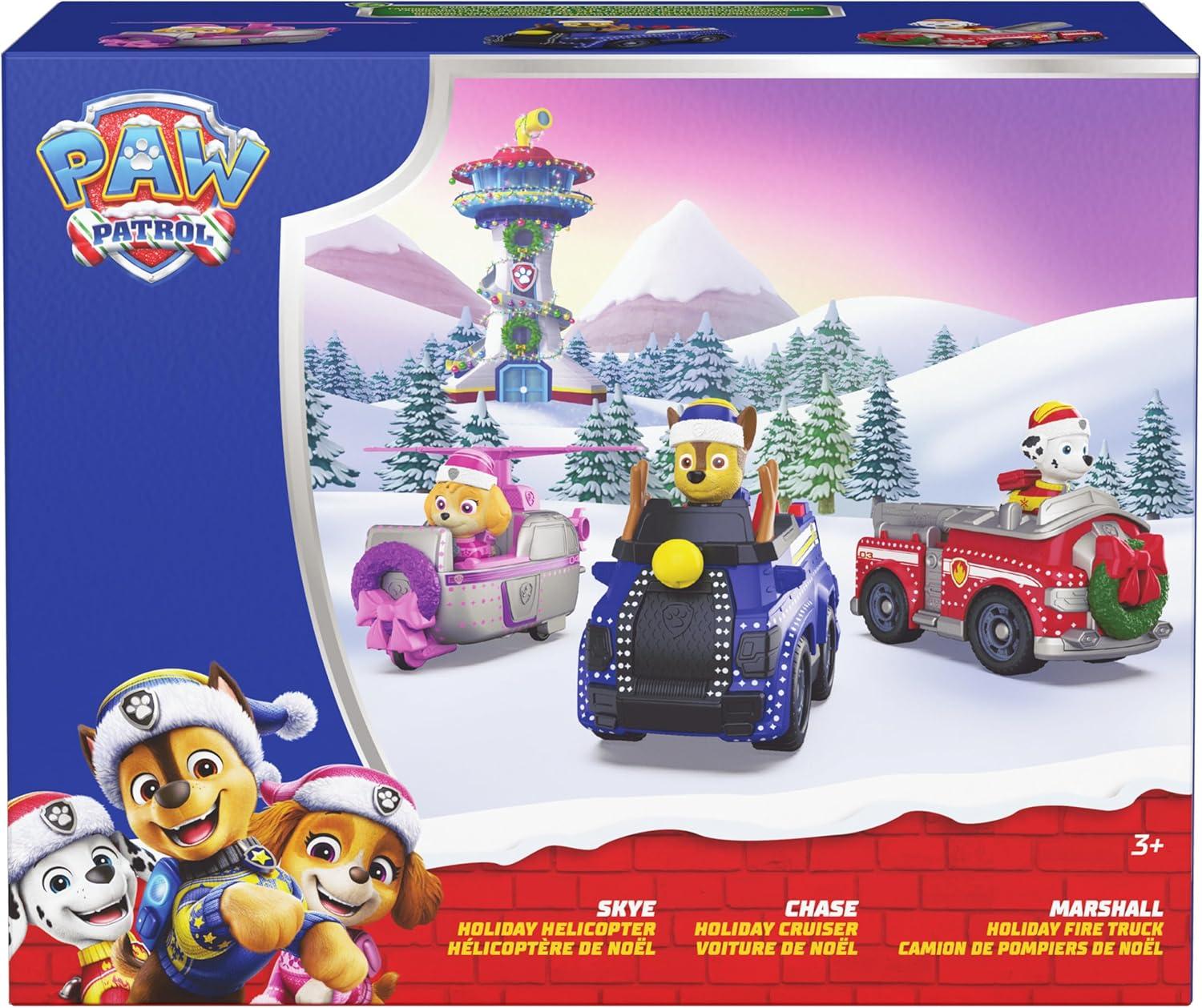 Holiday Rescue Fun: Dive into adventure with the PAW Patrol Holiday Vehicle Bundle Includes 3 PAW Patrol Toys—Chase, Marshall & Skye, each with their own festive vehicle