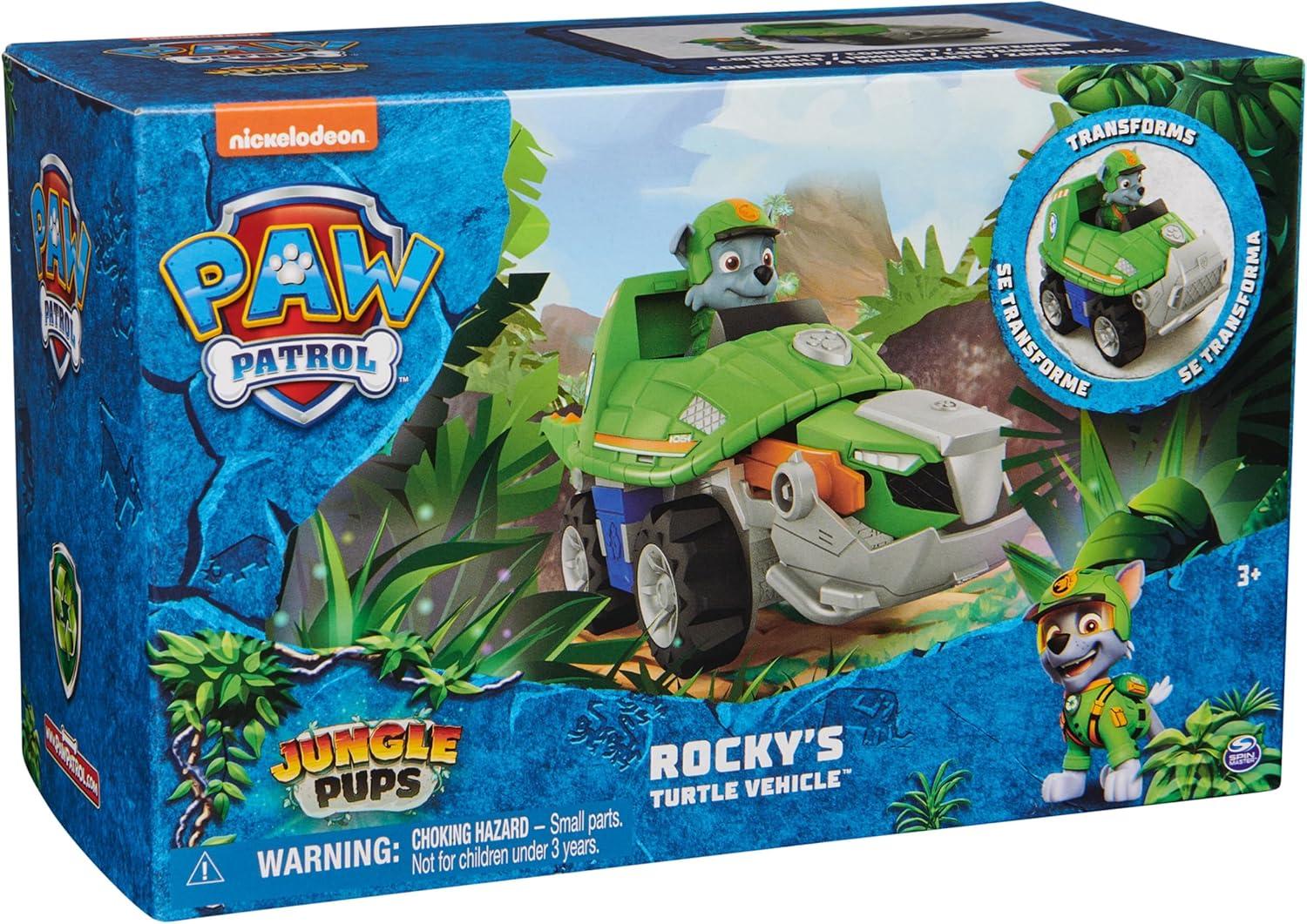 Rocky’s vehicle features an exciting transformation into rescue mode, by pushing down on the front of his vehicle, to expose the turtles beak then pulling out the tail, from the rear of the vehicle, before opening the turtles mouth, to complete the transformation! Use its tail and beak to clear away any obstacles and save the day! For even more fun and exciting PAW Patrol series-inspired missions, collect all the PAW Patrol Jungle Pups toys and the PAW Patrol: The Mighty Movie toys, like the awesome Aircraft Carrier HQ and all the special edition PAW patrol toys for girls and boys, like the Mighty Pups, Aqua Pups and Big Truck Pups toy figures and playsets (each sold separately). With PAW Patrol preschool toys, a kid can explore his or her imagination, and develop their motor skills through pretend play, as they relive their favorite scenes from the shows. Enjoy endless PAWsome adventures with Rocky and his Jungle Pups Snapping Turtle Vehicle!