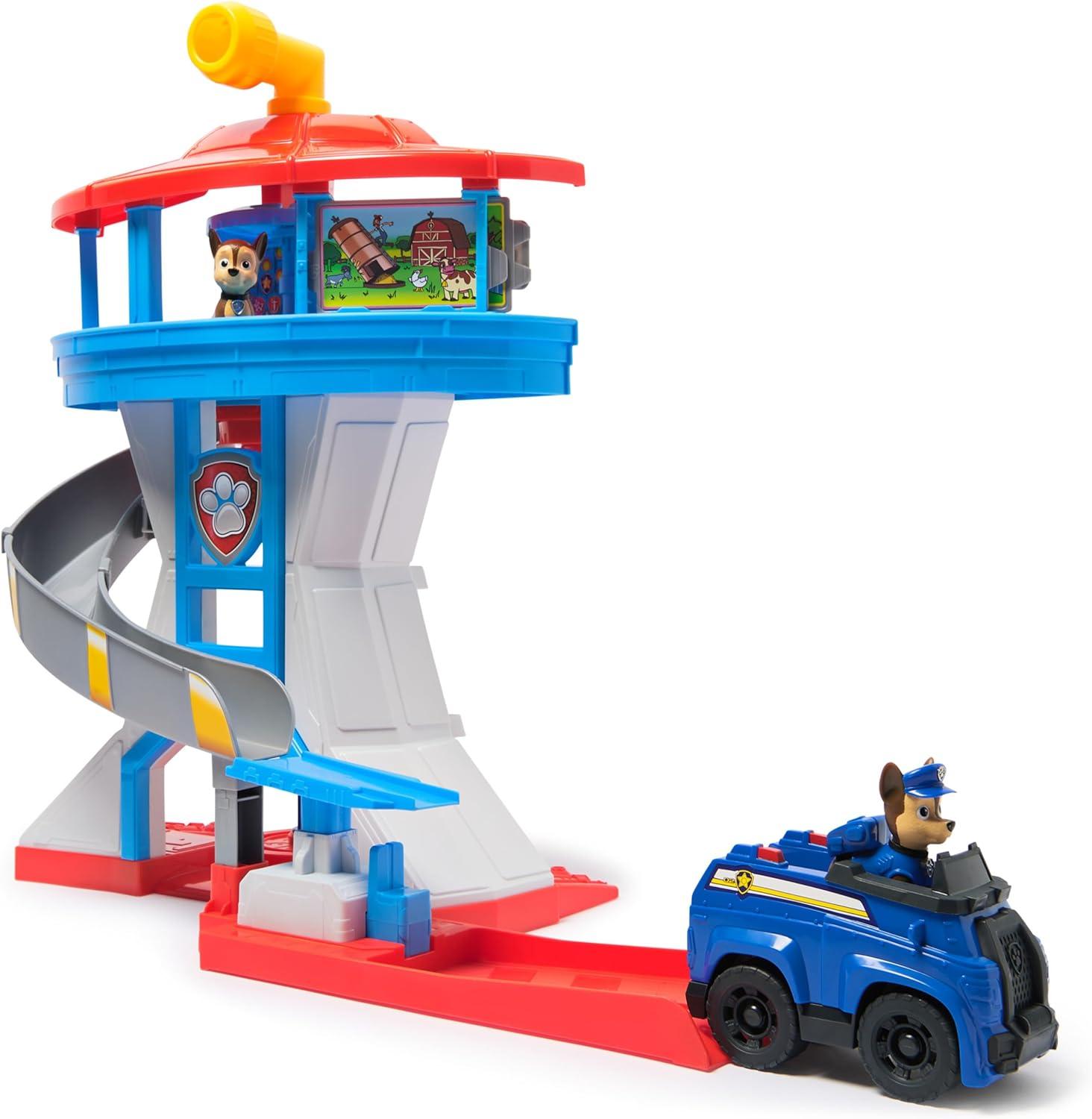 Join the PAW Patrol team with the PAW Patrol Lookout Tower—a 20-inch playset packed with excitement and adventure! This tower, with its genuine PAW Patrol styling, is the ultimate command center for thrilling missions. It includes two Chase toy figures and a police cruiser vehicle, making it PAWfect for imaginative play. When it’s time for an exciting rescue, place off-duty Chase into the front of the tower elevator, and place hero-pup Chase into the back of the elevator. Raise the elevator to make it rotate and watch off-duty Chase get ready for action as he turns into hero-pup Chase! The elevator locks in place until it's time to race to the rescue! With three double-sided mission cards, children can decide the day's mission and launch Chase down the slide into his vehicle, ready to save the day. These pup-tastic learning toys are PAWsome birthday or holiday gifts for boys & girls that love the series. Relive cherished moments from past PAW Patrol seasons, like the Mighty Pups and PAW Patrol Movie or create entirely new adventures with a PAW Patrol tower, individual PAW Patrol action figures and their respective PAW Patrol vehicles, for endless hours of turbo-charged adventures