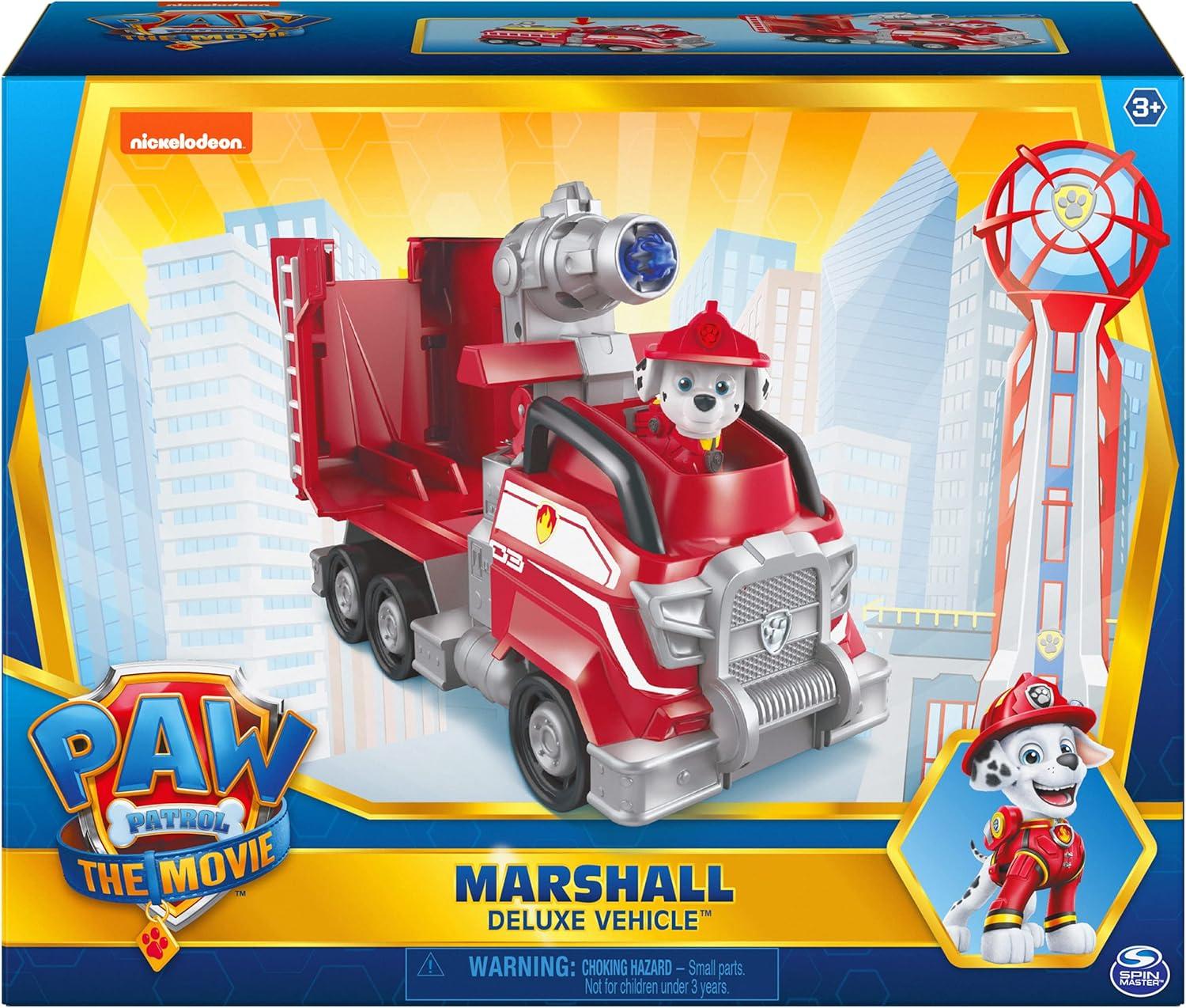 Team up with Marshall for bigger, bolder rescues with his PAW Patrol: The Movie transforming Deluxe Vehicle! Marshall’s sleek city toy fire truck features silver metallic paint, authentic movie details and graphics, and an exciting transformation straight from the movie! Suited up in his all-new movie uniform, Marshall (collectible action figure included) is ready to save the day in Adventure City. When trouble strikes, place Marshall behind the wheel of his fire truck and race to the rescue! Push down on Marshall’s truck to activate the vehicle’s unique transformation. The back opens up, revealing a pop-up water cannon launcher! Load the included projectile and press the button to launch! Reset, transform and launch again and again! Marshall’s toy truck is a great gift for kids ages 3 and up and is the perfect addition to any PAW Patrol vehicles and toy figures collection. The PAW Patrol The Movie Toys Deluxe Vehicles bring the action and excitement from the big screen to life! Collect them all (toy vehicles each sold separately) and use your imagination to play out your action-packed rescue missions. For even more movie action, use your Deluxe Vehicle with the all-new PAW Patrol tower, the Ultimate City Tower (sold separately)! Save the day with Marshall and his PAW Patrol: The Movie Deluxe Vehicle!