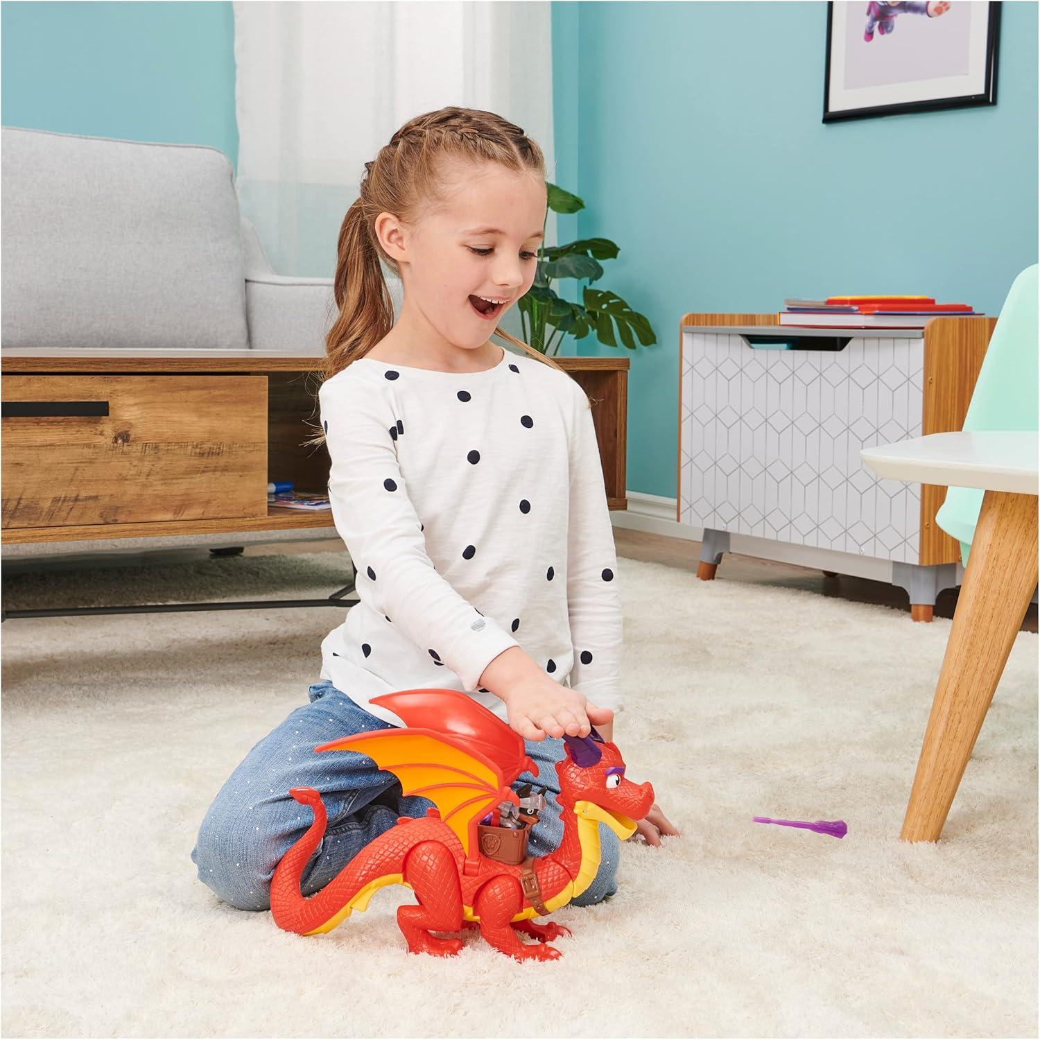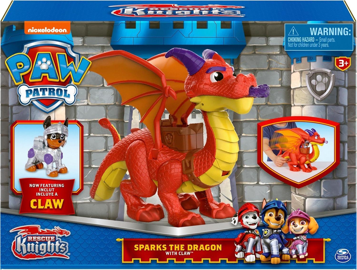 Get fired up for Rescue Knights medieval missions in Barkingburg with PAW Patrol Sparks the Dragon and Claw! This set of action figures comes with an exclusive figure of Claw the pup, a large-scale Sparks the Dragon figure with his super wings, two projectiles and a saddle for Claw to ride in! Both Sparks and Claw feature authentic character details and look just like the characters from the show! When it’s time to fly, use the saddle’s clip to hold Claw in place, then hold Sparks by the tail and squeeze the easy-to-use button on his tail to begin flapping his super wings! Make your dragon and pup duo fly around, just like they do in the show and press down on Sparks’ horns to launch the “fire breath” projectiles! For even more ways to relive your favorite PAW Patrol scenes, look for the Rescue Knights pups and dragons and the Castle HQ (toy figures and playset each sold separately). This exciting set is the perfect way to expand your PAW Patrol collection and thrill your imagination through fun and exciting pretend play. Bring home dragon-sized fun with the PAW Patrol Rescue Knights Sparks the Dragon and Claw Figure Set!