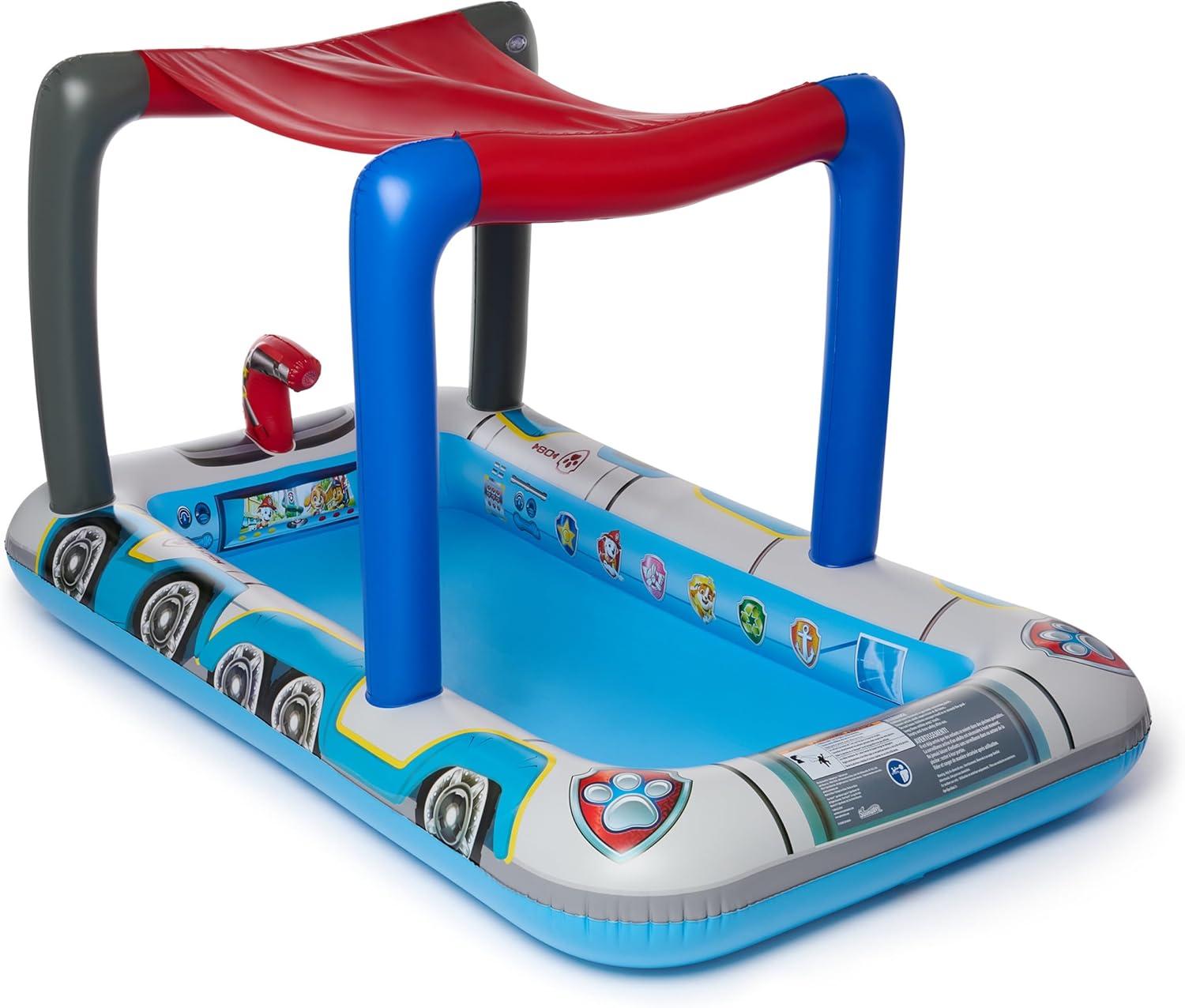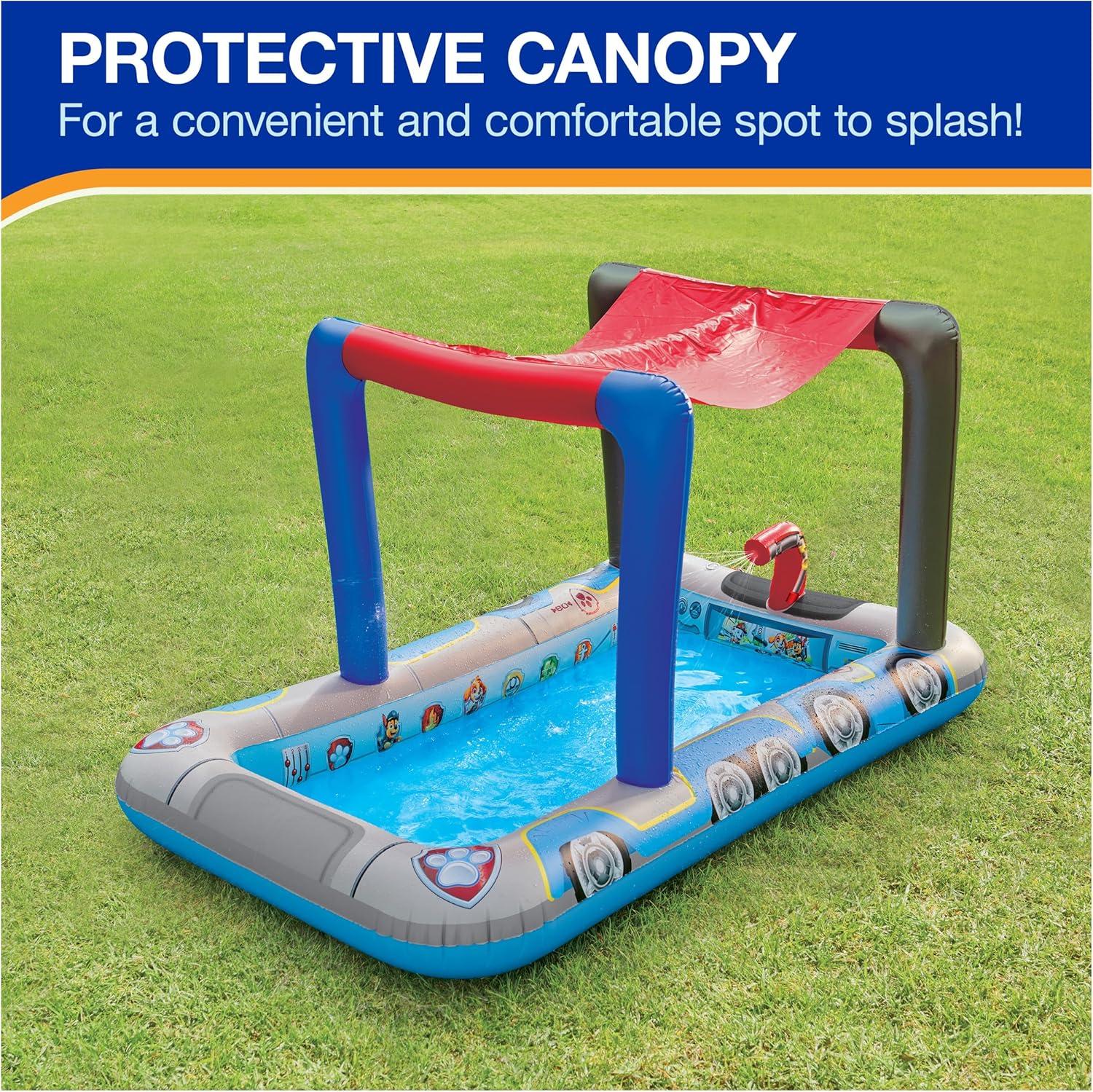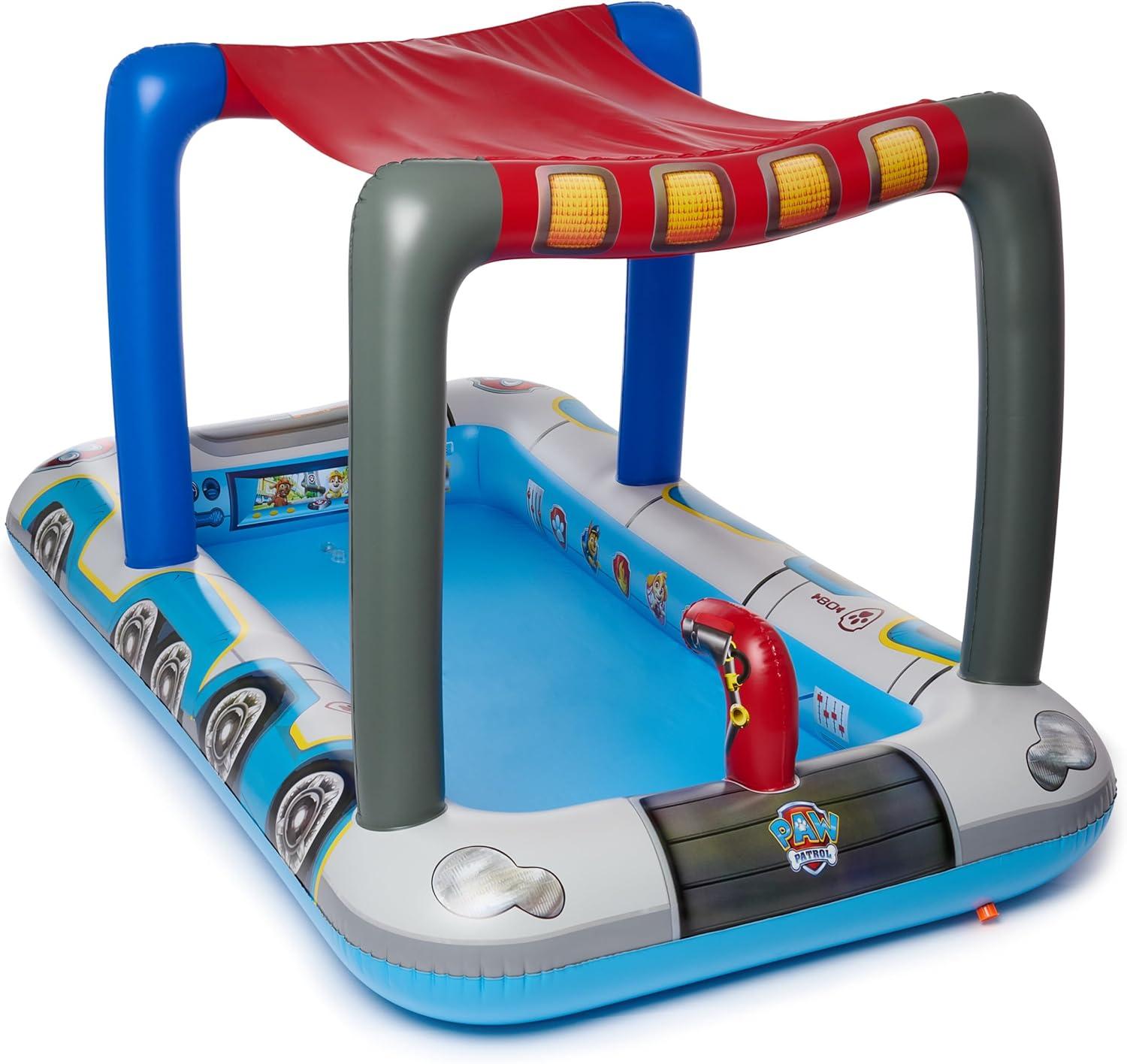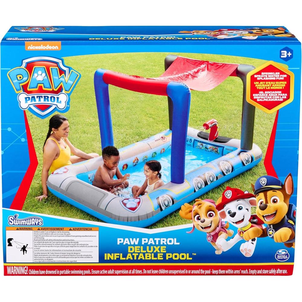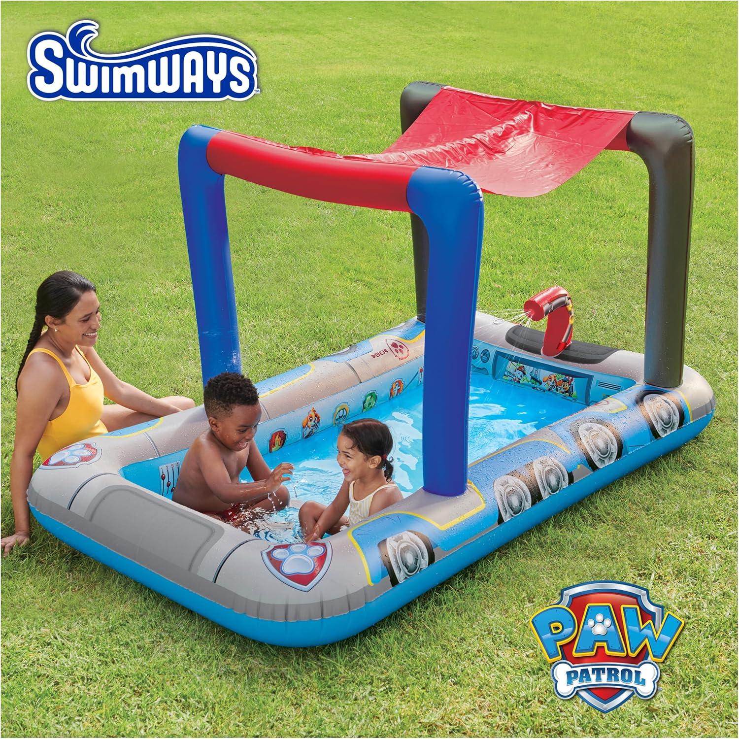 Help your favorite pups save the day on the seven seas with the Swimways Pool Patroller Deluxe Inflatable Pool! Featuring your favorite pups from Paw Patrol, this Deluxe Pool will keep your children and their friends entertained with a water shooter and slide! This kid pool comes with our patented Hyper-Flate Valve for ultra fast inflation and quick and easy setup. Get your little ones in the water fast with 3x faster inflation and more outdoor fun on the go! These swimming pools come with a convenient valve for quick and easy draining and fill-up, so you can provide your child with fresh water in every use! With a pool canopy providing shade from the sun, your child can comfortably splash around in the water even on the hottest days! This backyard pool allows you to introduce your child to the water in a fun and safe way with a quick and easy setup thanks to the fast inflation and convenient design! When in use, ensure active adult supervision at all times. Do not leave children in or around the pool unsupervised and keep within arms' reach. Empty and store pool safely after each use. Suitable for children aged 3 and up.